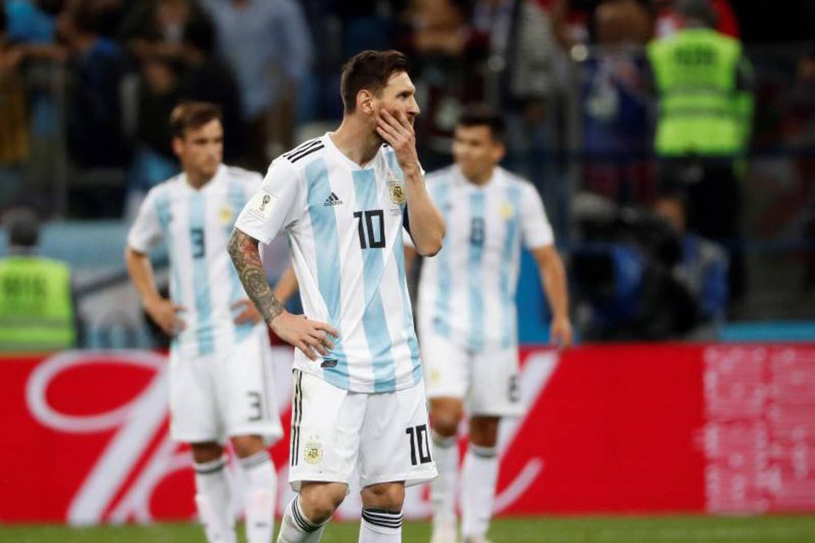 Durante el partido el futbolista argentino no se hizo sentir y al finalizar estaba muy afectado por la derrota de su selección ante Croacia, pues perdieron 0 a 3 y están guindando de la cuerda floja en el Mundial.