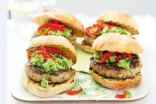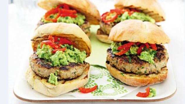 3. Caliente una sartén o una parrilla hasta que esté caliente. Tueste ligeramente los panes, con el lado interno donde van los ingredientes hacia abajo, durante 1 minuto, luego manténgalos calientes. Rocía con un atomizador las hamburguesas con aceite para evitar que se peguen, o utilice una brocha de cocina. Cocina por 7-8 minutos en cada lado hasta que esté chamuscado y cocido. Llena los panecillos con las hamburguesas, guacamole y tiras de pimentón.