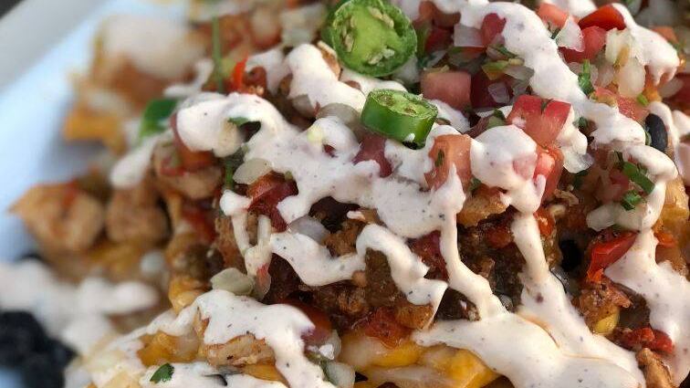 En la bandeja coloca dos lonjas de tortilla en cada uno de los cuencos. Luego, unta con los frijoles, agrega el pollo, arroz y el queso.