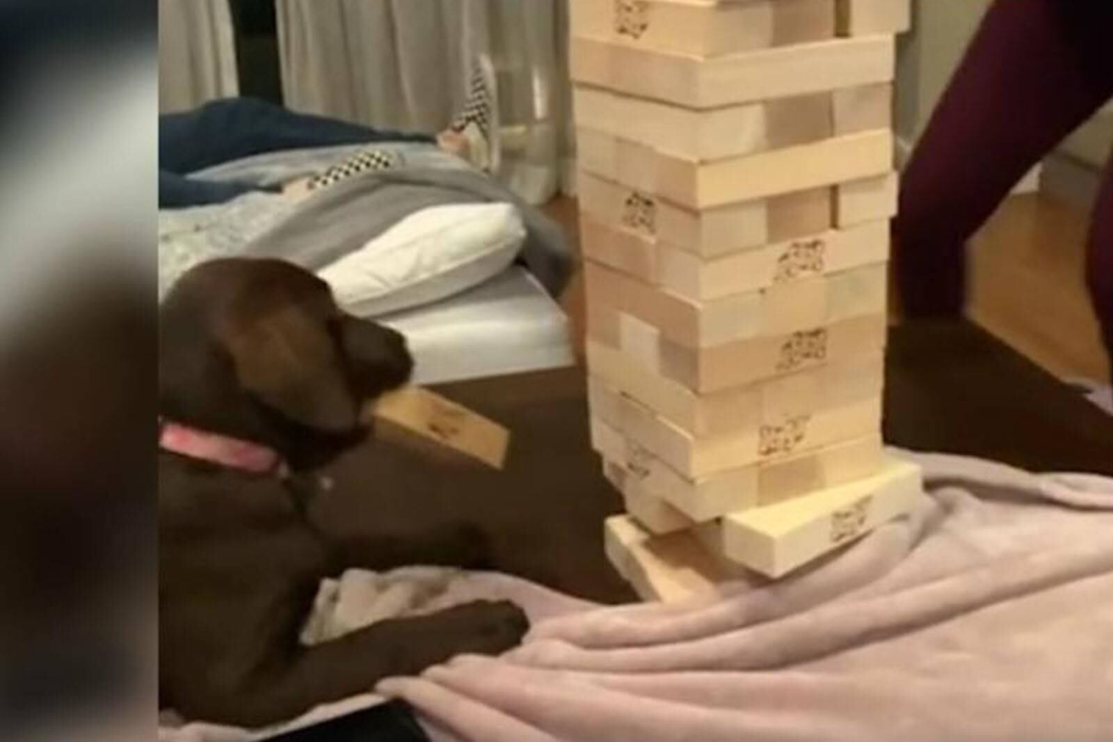 En el video se aprecia cómo el perrito, un Labrador, logra sacar un bloque de la torre con mucho cuidado, sin caerse y se va con la pieza, causando euforia en todos los presentes.