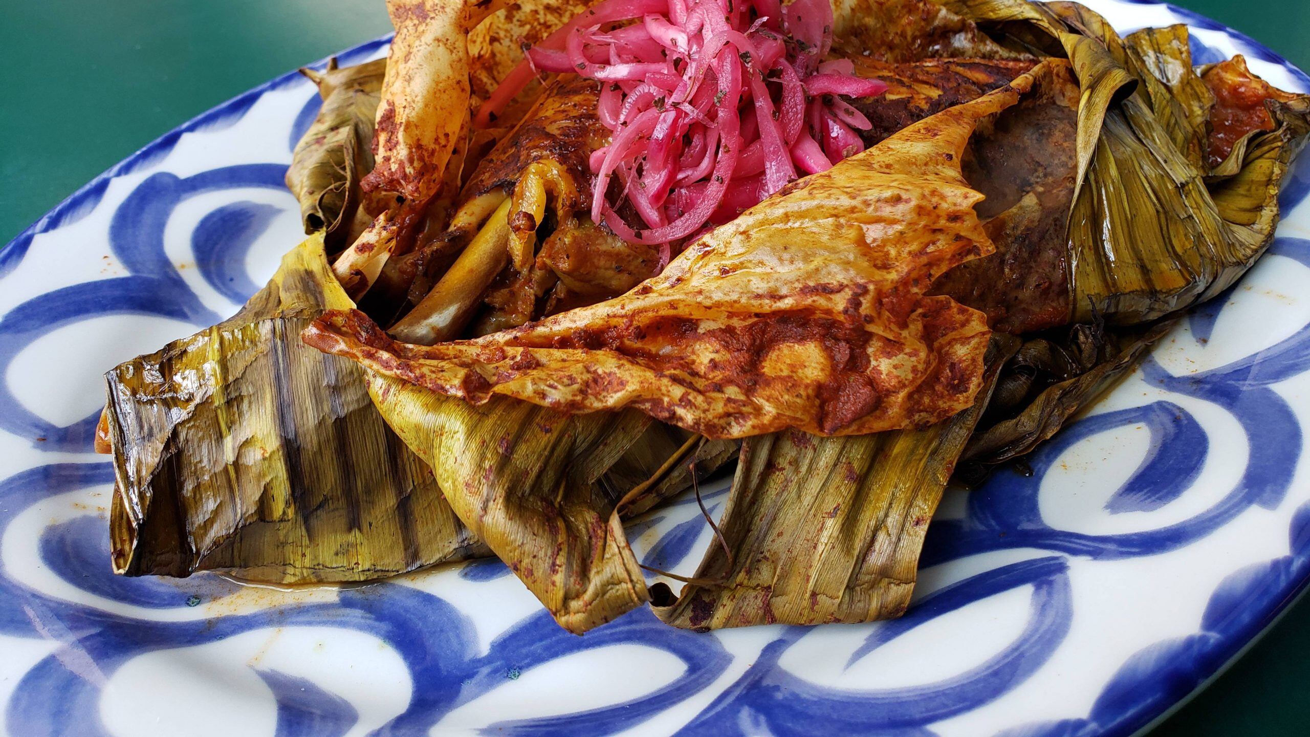 - Mixiote prehispánico – Pierna y muslo en adobo envuelta en hoja de maguey y acompañada de arroz blanco.