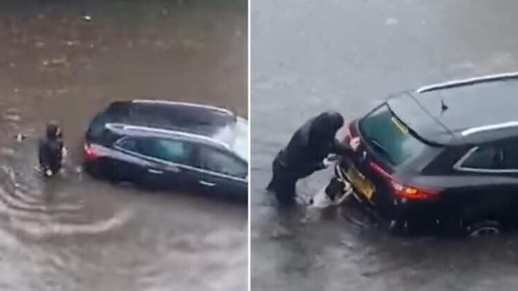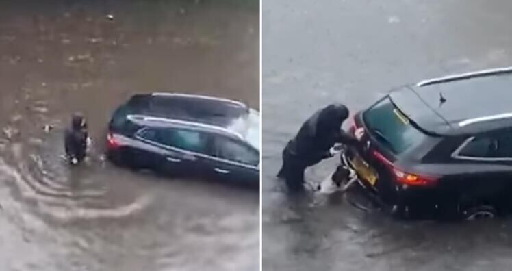 Vestida con impermeables y sumergida en agua hasta la parte de su cintura, la mujer se vio obligada a empujar su carro tras quedar atrapada en medio de la inundación.