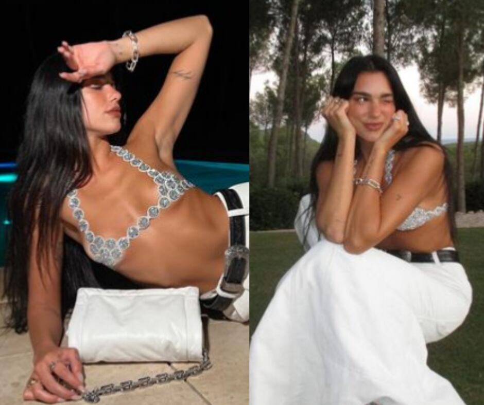 Celebrando sus 27 años, Dua Lipa luce más increíble que nunca. En las fotos, publicadas en su cuenta oficial de Instagram, se le ve con un diminuto top de diamantes de Marc Jacobs, una maxi falda blanca de los 90, unas plataformas blancas de Versace, un bolso a juego con su look y un cinturón negro.
