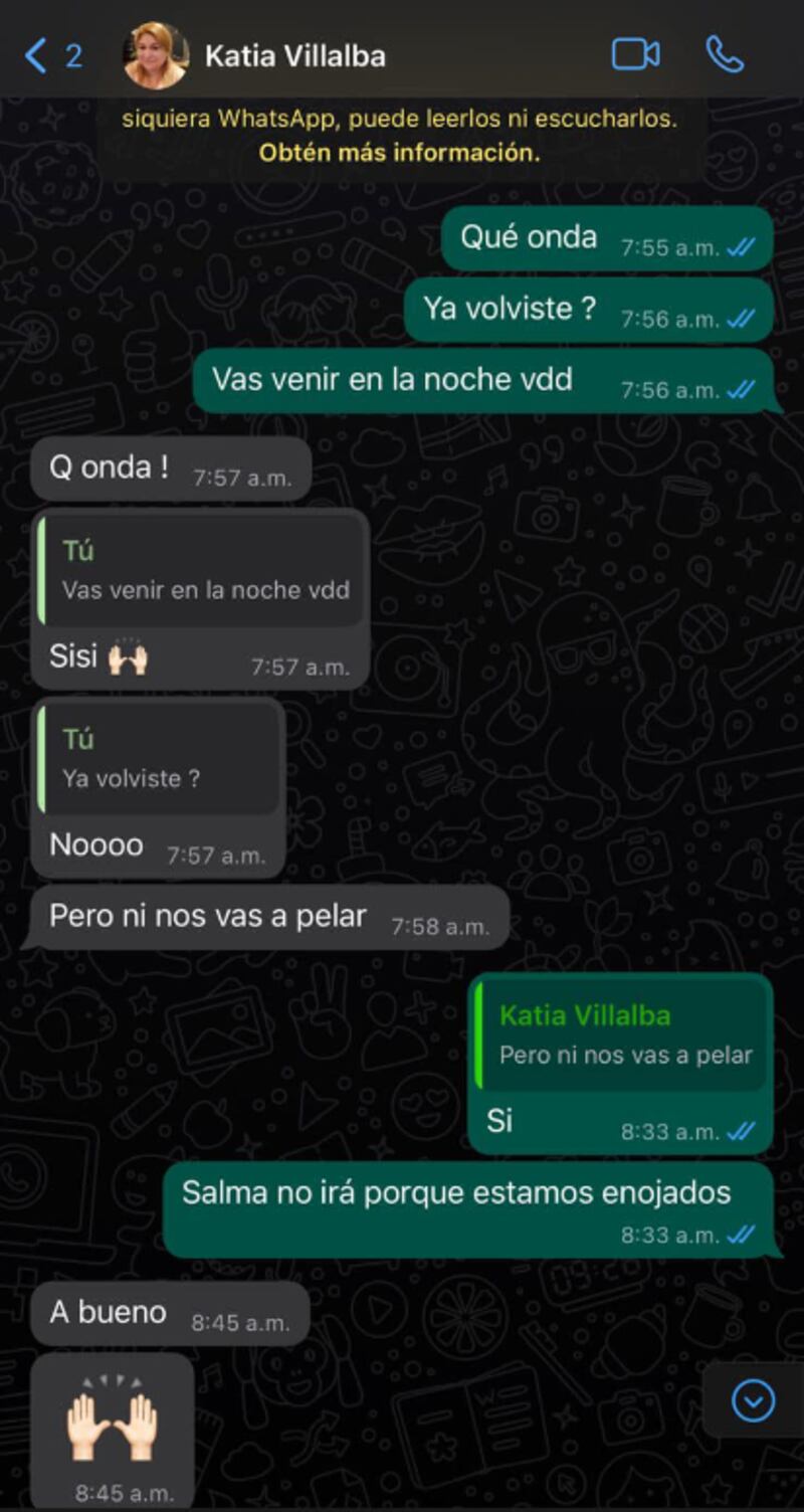 Gracias a esa charla, se supo que la ‘otra’ en la relación era la ‘mujer mayor’, pues mencionan a Salma en varias ocasiones mientras intenta cerrar una cita con su novio.