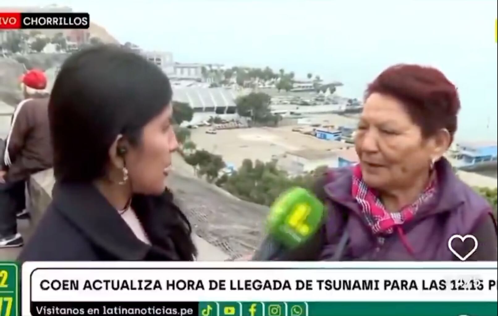 La gente por su parte, decidió refugiarse en los lugares más altos de la costa, y en una transmisión en vivo, una reportera se encontró con una abuelita que decidió llevar a sus nietos para que vean por primera vez un tsunami.