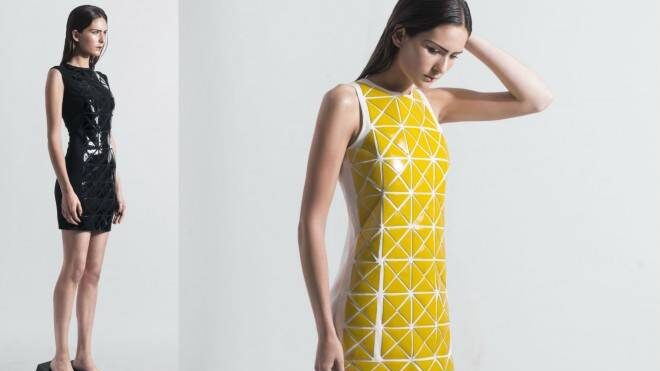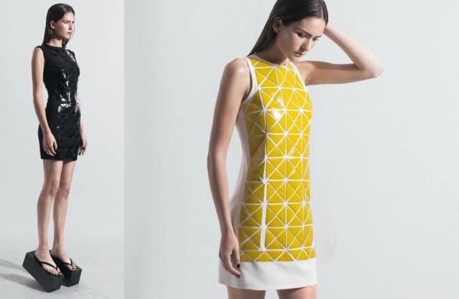 En la nueva línea vemos formas geométricas y una interesante mezcla de materiales. El cuero sobre algodón jersey hace una suerte de efecto armadura en sus nuevos diseños.