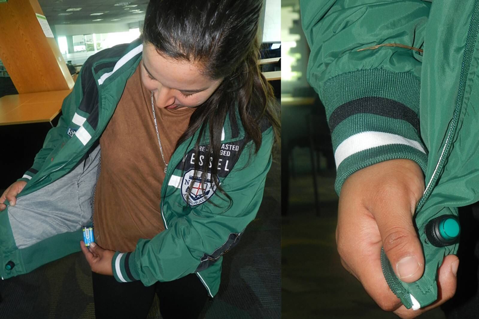 Esta chaqueta se activa de manera manual, un botón impulsa dos electrodos que se encuentran en el interior de la prenda. Estos emiten una descarga cercana a los 90 voltios, electricidad suficiente para combatir a los acosadores.