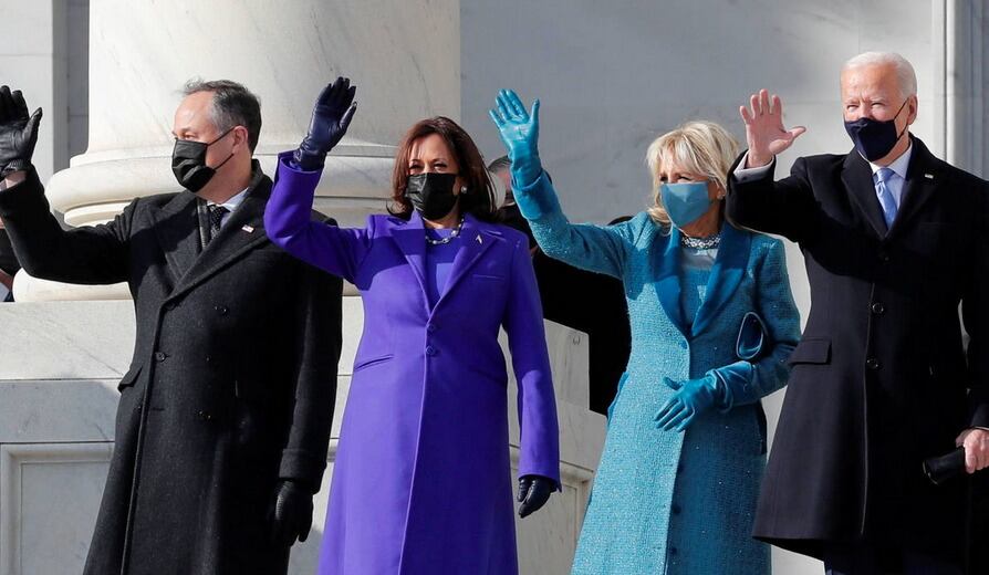 Azul como homenaje a la bandera de EE.UU. y al Partido Demócrata, y como color que procura confianza y estabilidad, fue el elegido por la nueva primera dama y el púrpura como calma y creatividad por la primera mujer vicepresidenta del país para el acto celebrado en Washington.