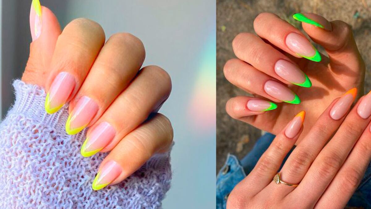 Puedes optar por cualquier tono neón, naranja, amarillo, verde, o rosa, y solo debes aplicar una base nude o de brillo y hacer las líneas en las puntas, pero de lado.