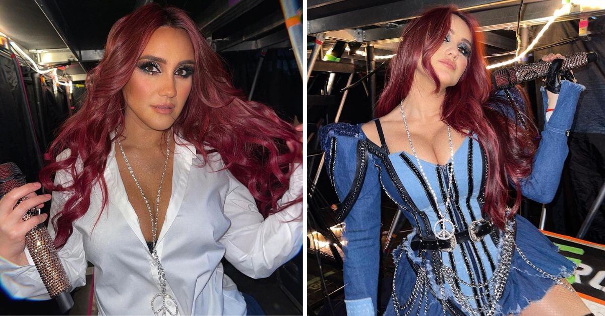 A esto se suma un beauty look donde su larga melena roja robaba toda la atención, complementando con un maquillaje ligero en tonos durazno, añadiendo protagonismo a su mirada con sombras marrones y largas pestañas, acompañada de una guitarra acústica negra.