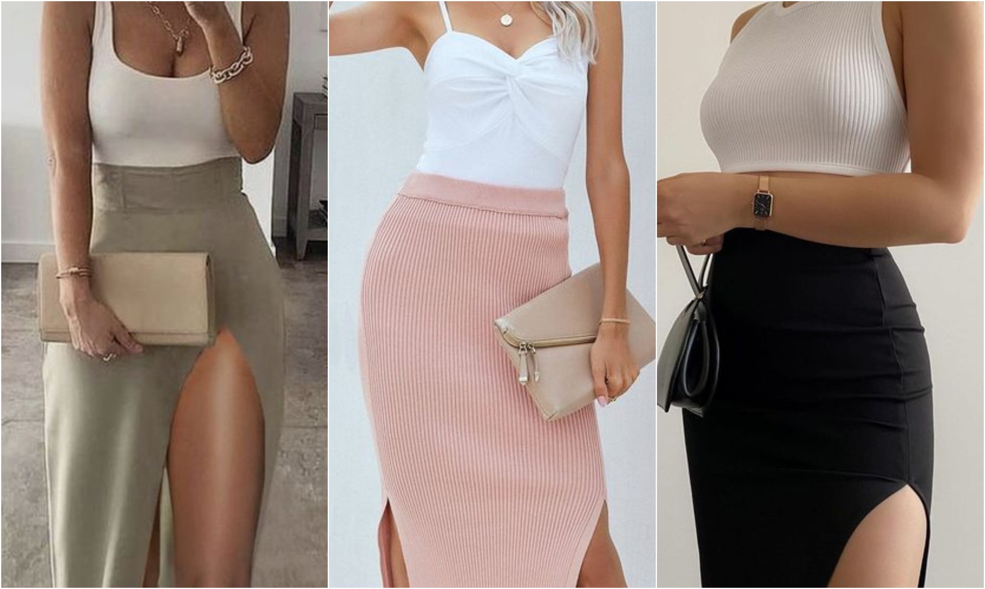 Para ocasiones especiales, la falda maxi con abertura lateral en materiales lujosos como el terciopelo o la seda es una elección inmejorable. Este tipo de falda no solo destaca por su longitud y fluidez, sino también por la sofisticación que aporta el material. Combinada con un top elegante, como un corsé o una blusa con tirantes, se crea un look que emana glamour y sofisticación. Los tacones altos son indispensables, estilizando la figura y añadiendo un toque de feminidad. Un clutch brillante no solo es práctico para llevar lo esencial, sino que también actúa como un accesorio de moda, añadiendo un toque de brillo al conjunto. Este look está diseñado para deslumbrar en cualquier evento nocturno, desde una gala hasta una cena romántica, asegurando que te conviertas en el centro de todas las miradas. No tienes que apostar por colores oscuros, puedes usar claros y así le darás un giro a la noche.