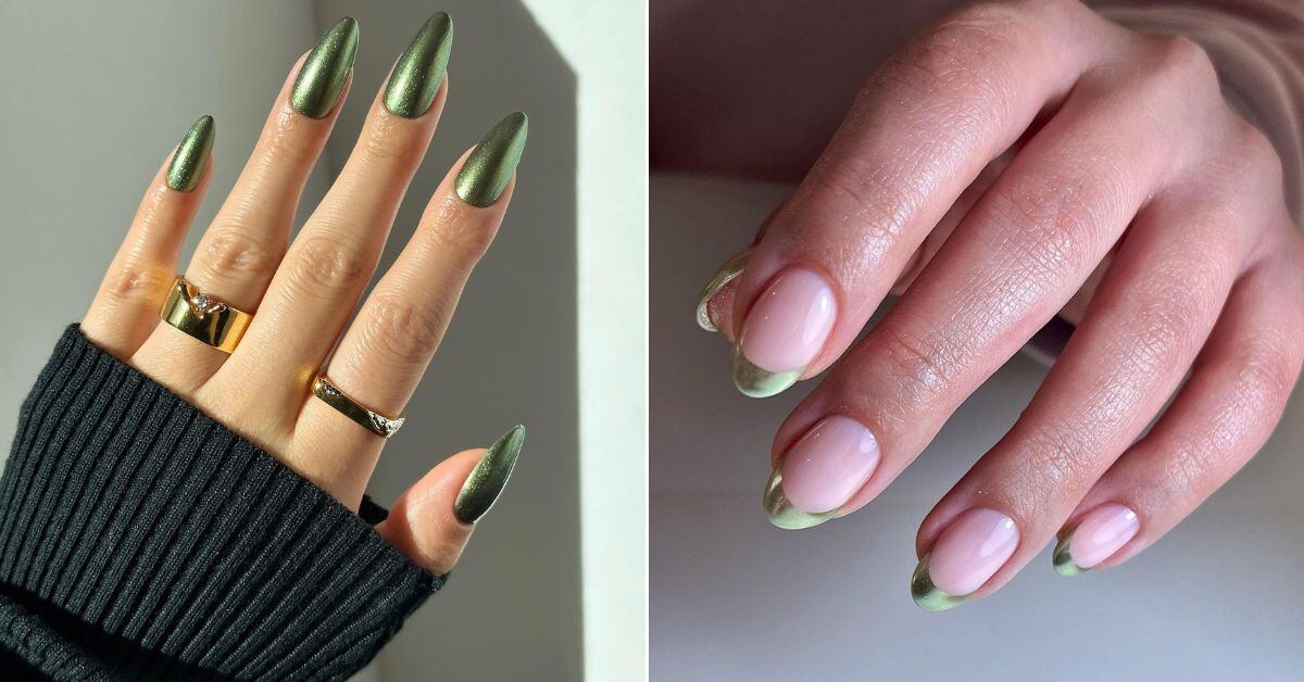 La tendencia engloba a una variedad de manicuras en color verde oliva y un brillante acabado cromado que queda de maravilla a todo tono de piel y se ve sensacional en cualquier largo y forma.