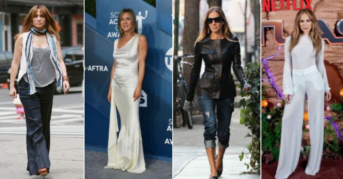 Pantalones acampanadas, lentes de aviador, sandalias de plataformas, vestidos midi ffluidos, son algunas de las prendas que las celebridades como Jennifer Lopez, Katie Holmes, Jennifer Aniston hasta Salma Hayek, están usando con mucha frecuencia.