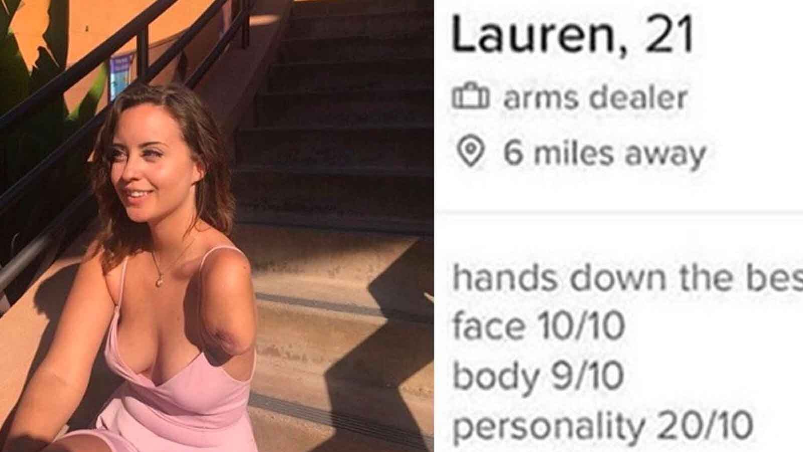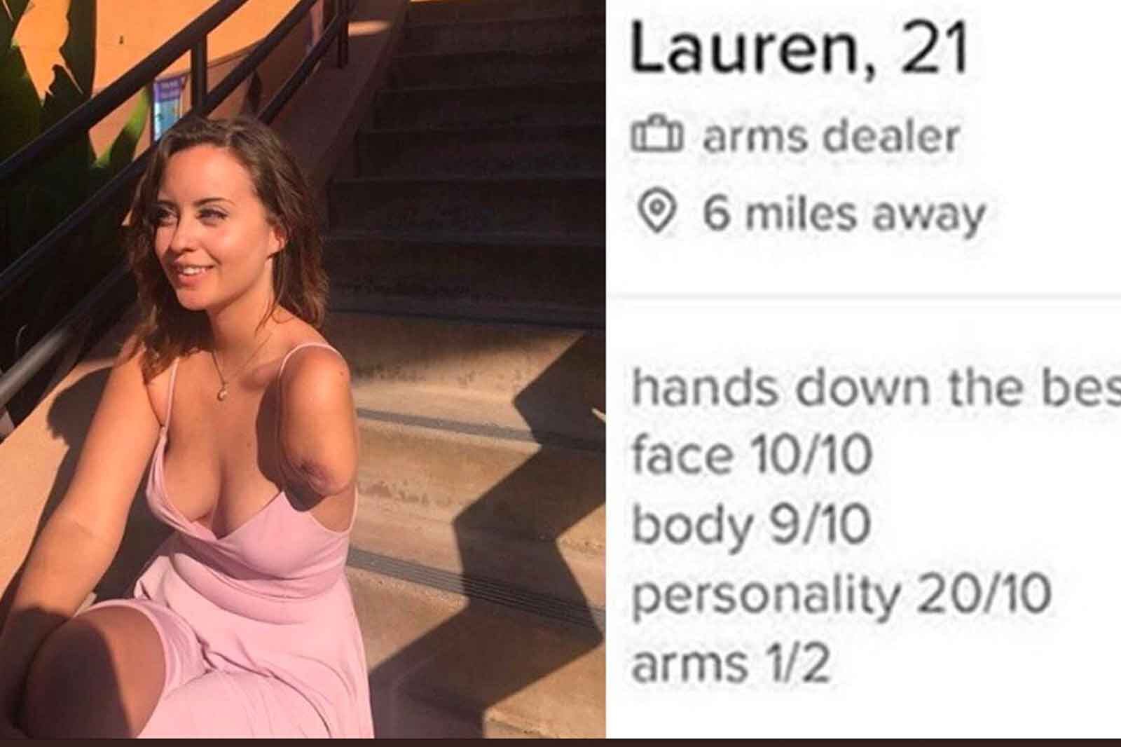 La joven se unió a Tinder y al poner su descripción no dejó pasar el hecho de que sólo tiene un brazo. Lauren sufrió un accidente en una motocicleta que hizo que le amputaran un brazo, desde entonces ha luchado por aceptar su nueva imagen.