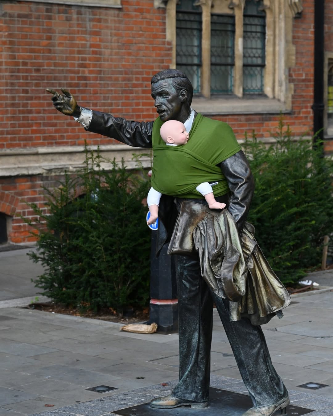 Ver a una estatua de un guerrero con un bebé de plástico en el pecho nos recuerda que la verdadera valentía hoy no se encuentra en las batallas de antaño, sino en la capacidad de una sociedad para proteger el tiempo de calidad entre padres e hijos.